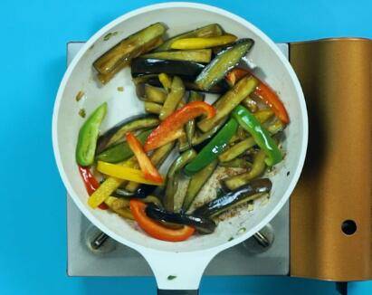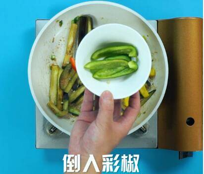 用料:茄子250克、彩椒50克、葱末5克、蒜末3克、食用油8毫升、生抽3克、盐2克、糖3克。