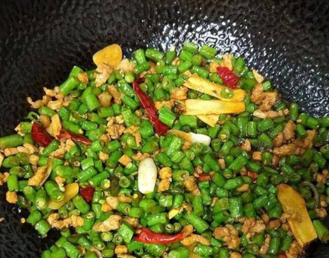 材料:猪肉、豆角、葱姜蒜、花椒、青椒、干红辣椒。