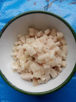3、把瘦肉、肥肉、猪皮分开切成丁。