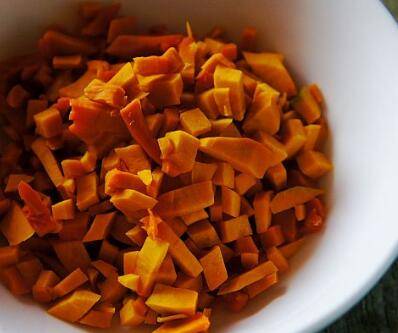 取一杯多谷米,反复淘洗干净。南瓜去皮去瓤,洗净切丁。