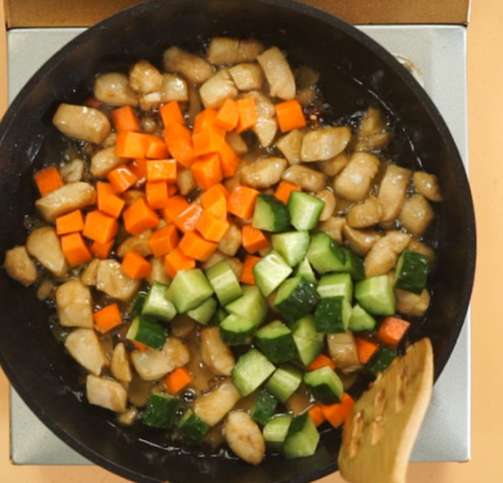 倒入黄瓜丁、胡萝卜丁、调好的汁;
