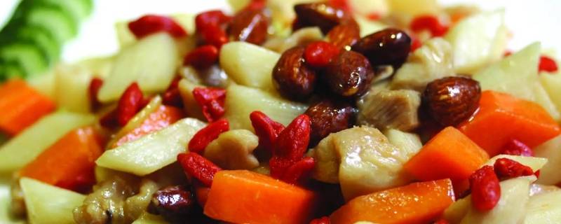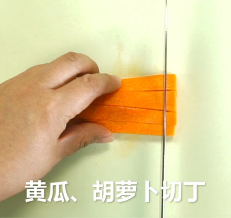 黄瓜、胡萝卜、鸡肉切丁;
