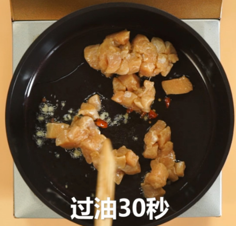 锅中放油,倒入姜末、干辣椒、花椒,倒入鸡肉丁,过油30秒;