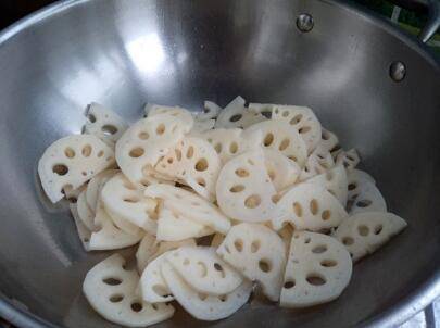 再起油锅,葱姜煸香后放藕片入锅炒。