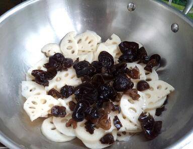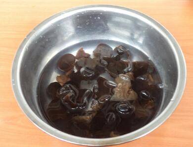 木耳入锅炒,加水,盖上锅盖烧一会儿,其间适时翻炒。