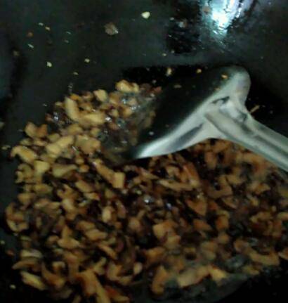 2、香菇用温水泡发,切丁,油炸,备用,花生炸后脱膜,打碎,备用。