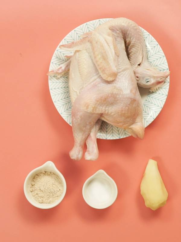 1、三黄鸡清洗干净,用厨房纸吸去水分。姜切片备用。