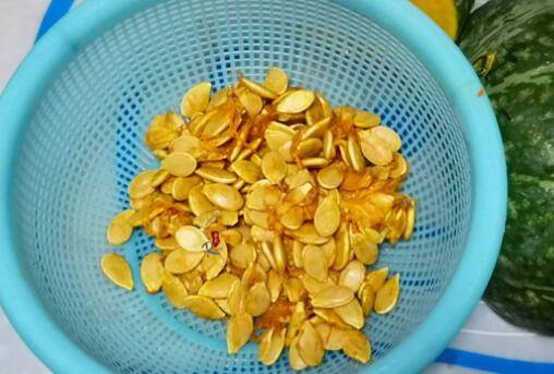 2、放入水中,先把瘪的挑出去,再把瓜瓤洗去,只留下瓜子。
