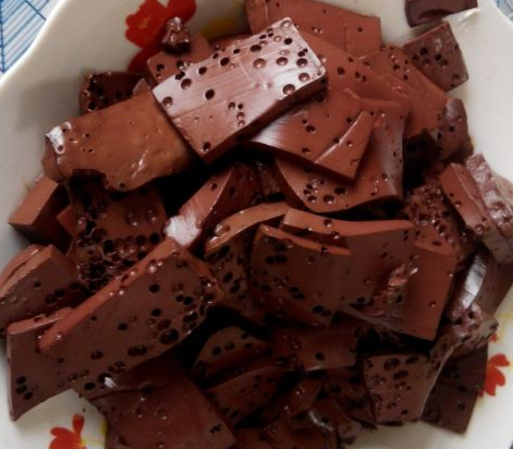 血豆腐一块,将血豆腐切成片;