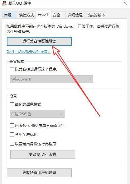最佳答案演示机型:华为MateBook X 系统版本:win10 APP版本:QQ9.4.2 以Windows10、华为MateBook X、QQ9.4.2为例。在电脑上找想要设置的应用,比如QQ,右键点击该应用,在弹出菜单中选择“属性”的菜单项。接下来在打开的软件应用窗口中点击“兼容性”的选项卡。在打开的兼容性窗口中点击“运行兼容性疑难...