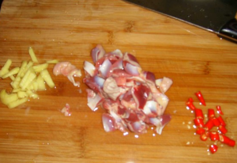 下油,放进辣椒、鸡肾和姜丝煸炒;
