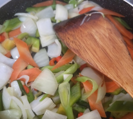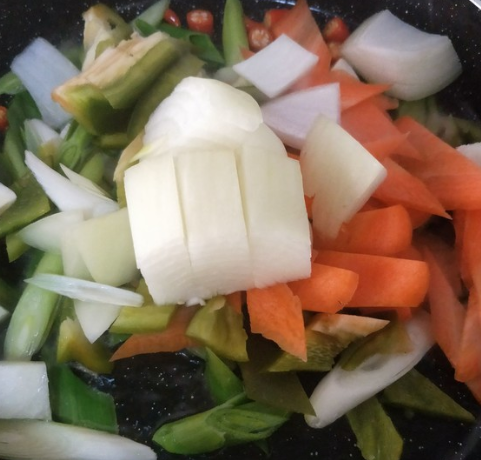 蒜苗2颗、洋葱100克、胡萝卜50克、青椒50克、小米辣2个改刀备用;