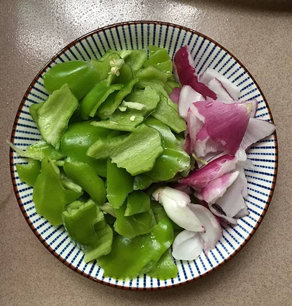 4、洗净的青椒,洋葱,直接用手撕成小块;生姜切丝。