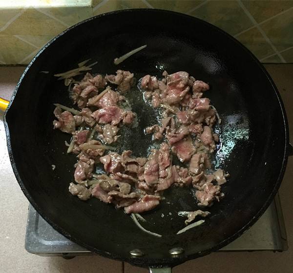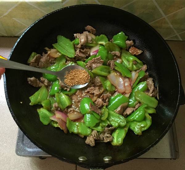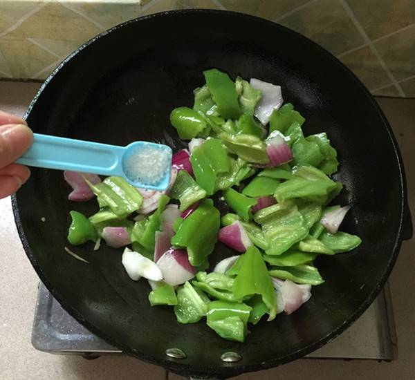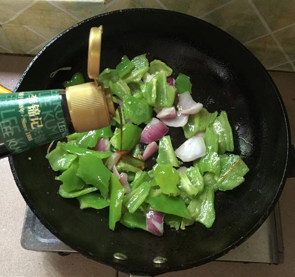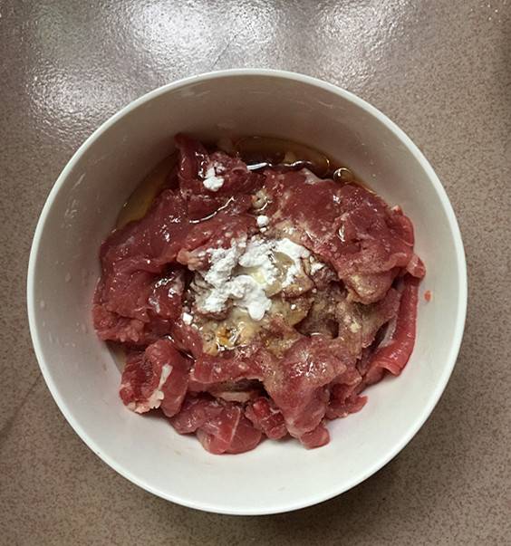 用料:牛里脊肉220克、青椒200克、洋葱60克、生抽酱油10毫升、蒸鱼豉油10毫升、料酒10毫升、生粉2克、生姜5克、精盐3克、原味鲜1克、食用油30毫升。