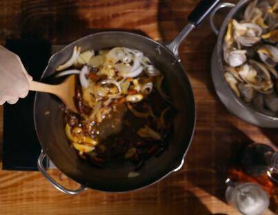 锅烧热后倒油,放入干红辣椒和郫县豆瓣酱及花椒,待炒出红油后倒入大葱 、姜蒜和洋葱炒香。