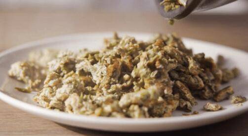 8、锅中倒入适量油,烧至七成热,倒入香椿蛋液。