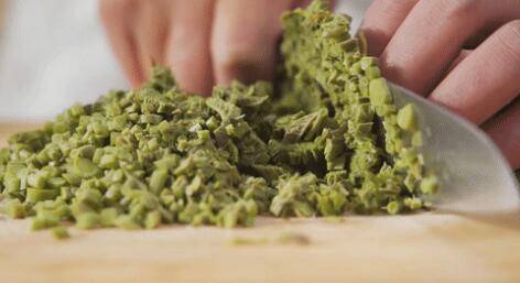 4、香椿控水后,去掉根部,切碎后放入碗中。