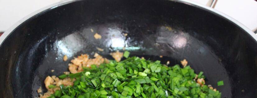 5、把切碎的韭菜倒入锅,大火翻炒,一定要大火,这样炒的韭菜才香,叶子不会黄。
