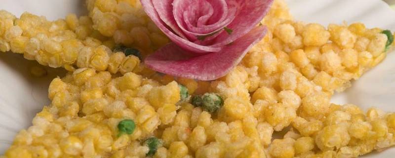 6、玉米烙:选用优质玉米粒,放入花生仁、红绿丝、干生粉、精盐、味精、砂糖拌匀,炒锅烧至六成热时放入食油滑锅,然后将玉米粒倒入锅内,摊成圆状,再将余油倒入,使玉米烙定型即成,切刀装盘。色泽金黄,入口松脆,香甜可口。