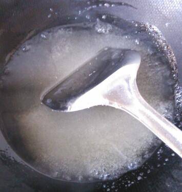 1大勺白糖加一点水,小火开始熬煮,让白糖溶化在水中。
