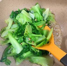 4、生菜翻炒均匀后加入一勺黄豆酱。