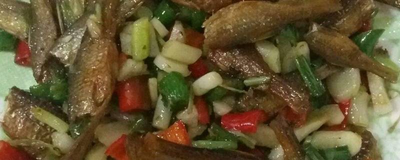 用料:小干鱼15个左右、嫩姜叶一把、鲜红绿线椒三根、大蒜二瓣、料酒、盐、鸡精、糖适量。