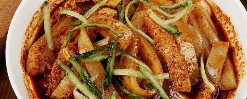 4、天水面皮:天水面皮用面粉制成,做法是将面粉用凉水和成硬团,然后在清水中揉搓,使面粉中的蛋白质和淀粉分离。淀粉沉淀后去清水,加放食碱,调成面浆,舀入平底盘上笼蒸熟成片,冷却后切成粗细长条即可。面筋则另外蒸熟,切成薄片,随碗搭配。加上油泼辣椒、精盐、酱油、蒜泥、芥末,香醋、芝麻酱等调料,再加一小撮青菜即可食用。天水酿皮具有色艳味美、凉爽利口、喷香解暑的特点,是天水市著名的地方风味小吃。
