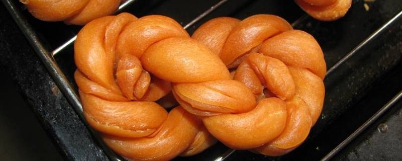取一个面团搓长,对折,拧成麻花。