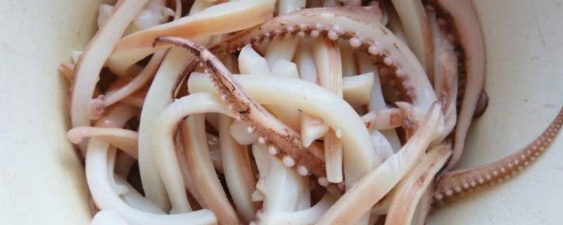 葱、姜切好,鱿鱼圈洗净,改刀成条。