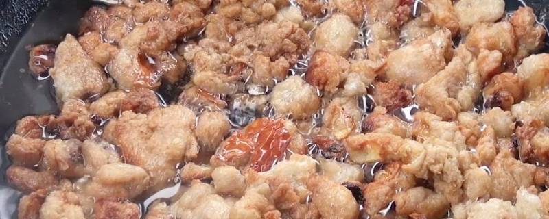 4、转小火不停地翻炒,这一步需要很有耐性,大约半小时后,肉缩水缩油后变成两面金黄的小块,就可关火(一定注意被油崩到,可以翻炒的时候拿锅盖挡着)。