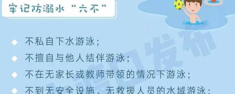 1、不私自下水游泳或到水边玩耍嬉戏。2、不擅自与他人结伴游泳。3、不在无家长或监护人带领的情况下游泳。4、不到无安全设施、无营救人员的水域游泳。5、不到不熟悉的水域游泳。6、不盲目下水施救。一会即学会基本的应急自救、求助、报警方法。