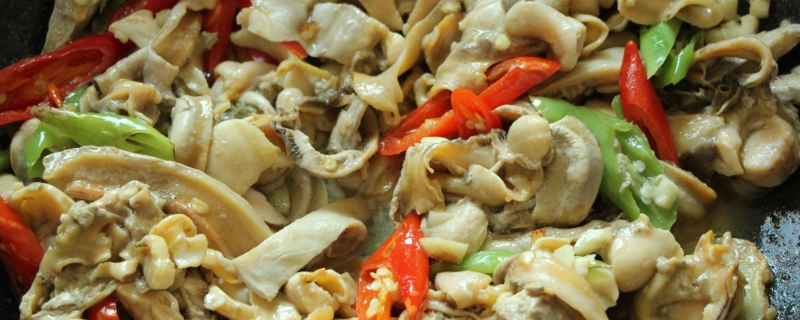 9、下贝壳快速翻炒,加盐鸡精少许糖调味,即可完成。