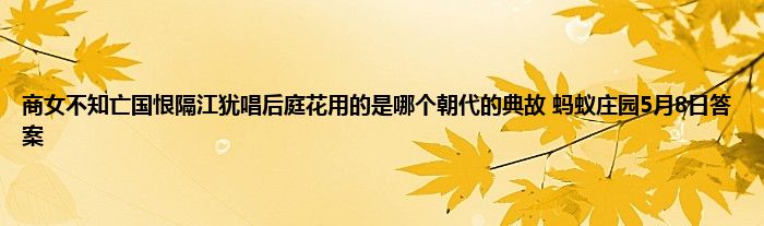 商女不知亡国恨隔江犹唱后庭花用的是哪个朝代的典故?蚂蚁庄园5月8日的问题正式发布,如果回答正确就可以领取奖励,可能很多的玩家还不太清晰具体的答案是什么,为了让大家都能领取到小鸡饲料,下面就是蚂蚁庄园小课堂5月8日的答案和答案解析。