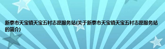 1、 新泰市天宝镇天宝五村志愿服务站是由泰安高新区天宝镇志愿服务总站领导下的志愿团体。