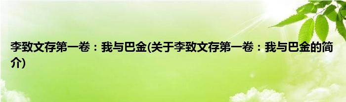 最佳答案大家好,李致文存第一卷:我与巴金,关于李致文存第一卷:我与巴金的简介很多人还不知道,现在让我们一起来看看吧! 1、 《李致文存第一卷:我与巴金》是2019年四川人民出版社出版的图书。2、 。本文关于李致文存第一卷:我与巴金的简介就讲解完毕,希望对大家有所帮助。