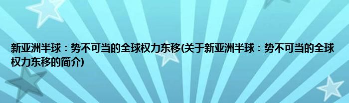 大家好,新亚洲半球:势不可当的全球权力东移,关于新亚洲半球:势不可当的全球权力东移的简介很多人还不知道,现在让我们一起来看看吧!